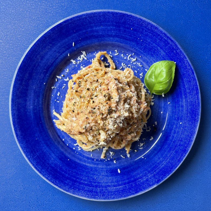 - 茹で上がったパスタを加え、パルミジャーノを一部加えてよくあえ、味見をして塩で調味する。