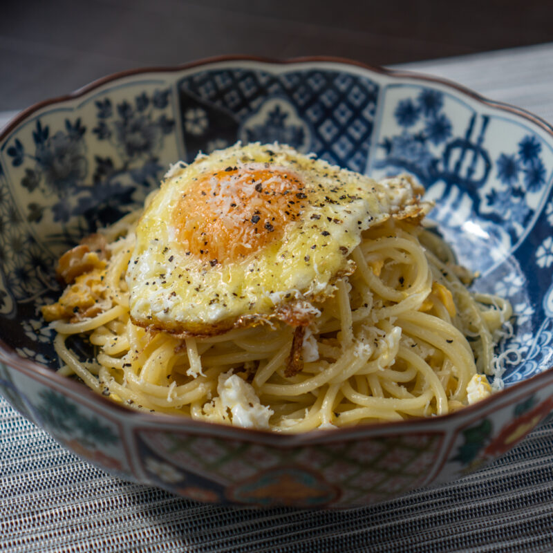 イタリア語で「貧乏人のパスタ」 。目玉焼きを2つ焼き、1つは崩してパスタと和え、もう1つは上に乗っけました。 シンプルながら卵の旨みがしっかり効いているおいしいパスタ。目玉焼きを上手に焼いてあげると、とてもおいしいご馳走パスタになります。