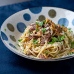 ツナの旨味に梅干しの酸味、シソの香りが爽やかな一皿。黒胡椒やガーリックチップ、胡麻の香ばしい香りでパスタらしい食べごたえもしっかりあります。作るのもお手軽簡単でとっても美味しいので、ぜひ一度お試しを!