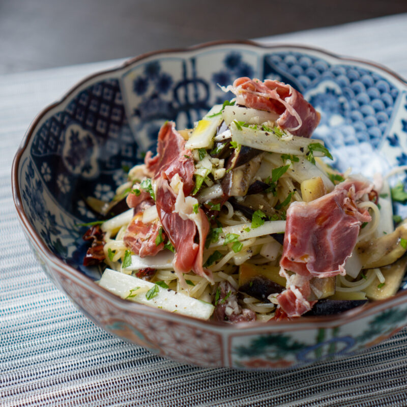 2種の野菜をマリネして冷製仕立てにした初夏らしい一皿。 ナスはレンジで加熱、ウドは軽くアク抜きしてい…