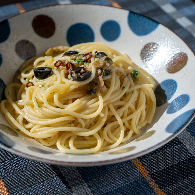いつものペペロンチーノに黒と緑のオリーブを投入。 シンプルですがオリーブの塩気・酸味が効いて美味です…
