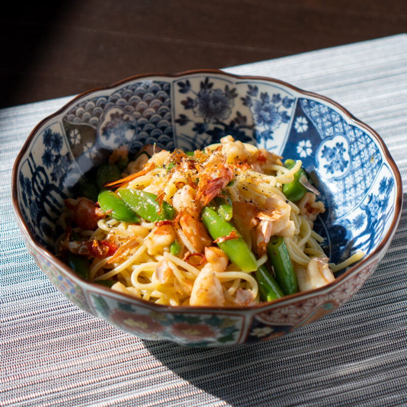 殻付きの海老があったので、剥いた殻をオイルでじわじわ加熱して海老出汁を取り、スナップエンドウと合わ…