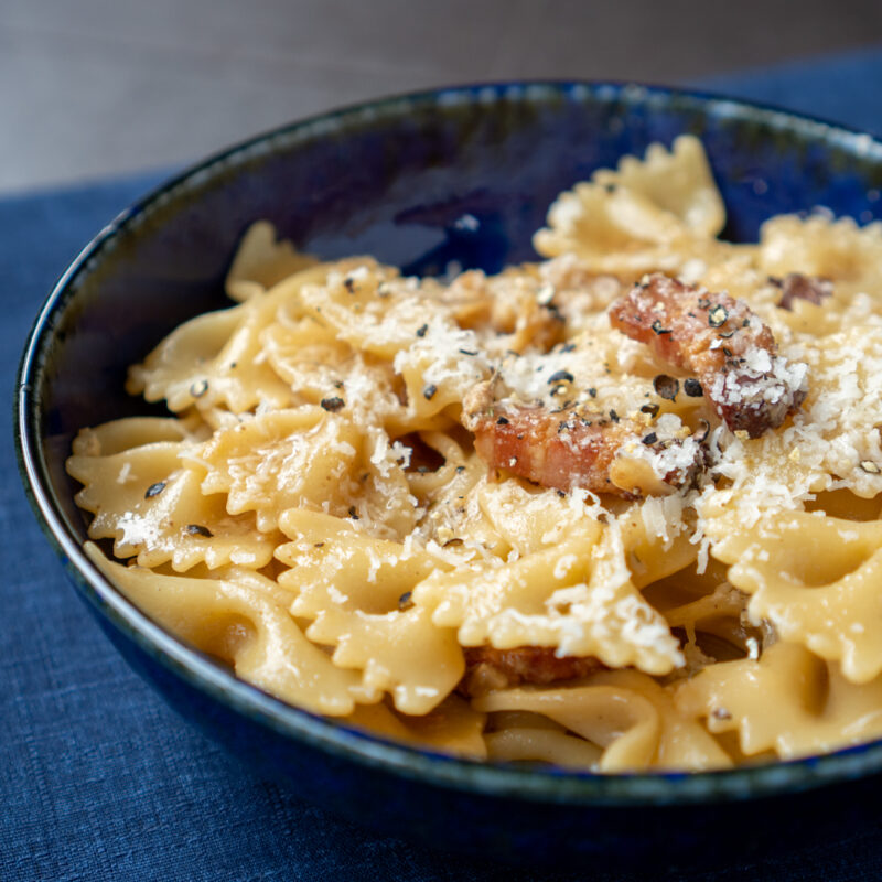 分厚めのパンチェッタをしっかり炒めてスダチと山椒、タイムなどで香り付けしました。 濃厚な味がスッキリ…