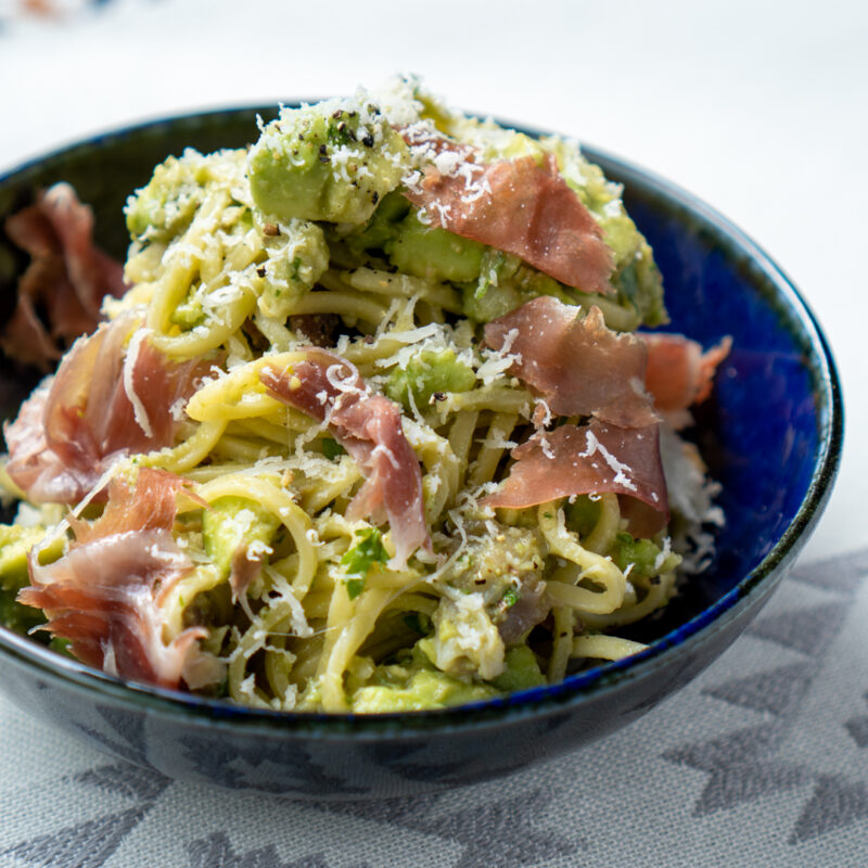 アボカドとハーブ類にバルサミコなどを加え、生ハムと混ぜた簡単パスタです。 簡単ですが、アボカドのクリ…