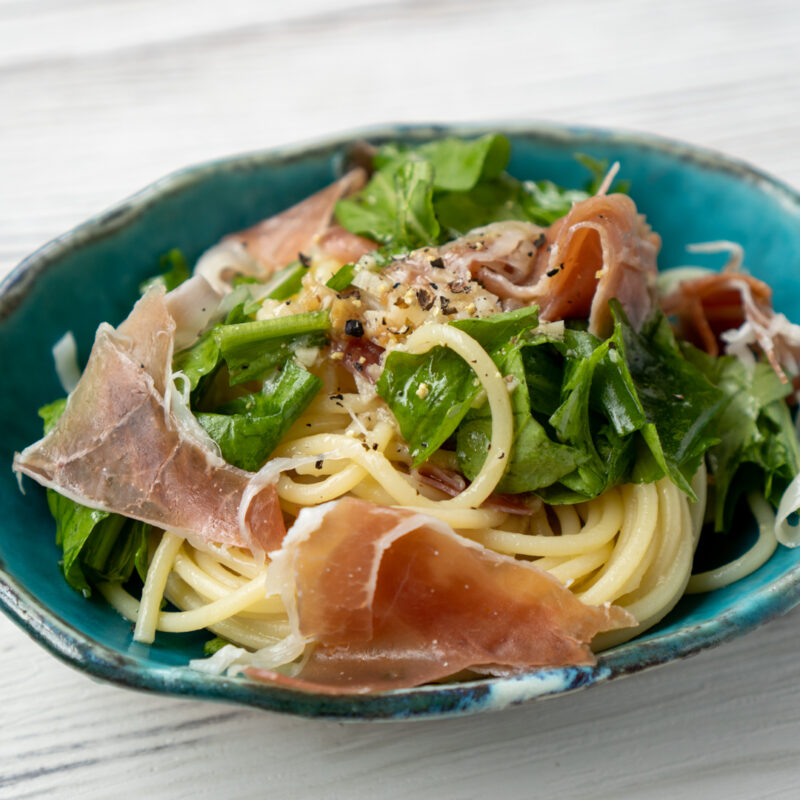 生ハムとルッコラのペペロンチーノ・スダチ風味