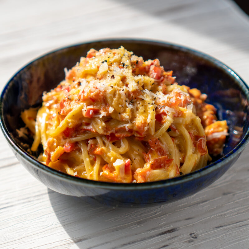 パプリカと玉ねぎをじっくり炒め、クリームで煮込んだパスタ。