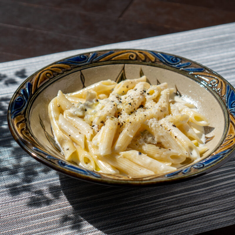 - 茹で上がったパスタを加え、よく混ぜる。味見をして塩で調味する。